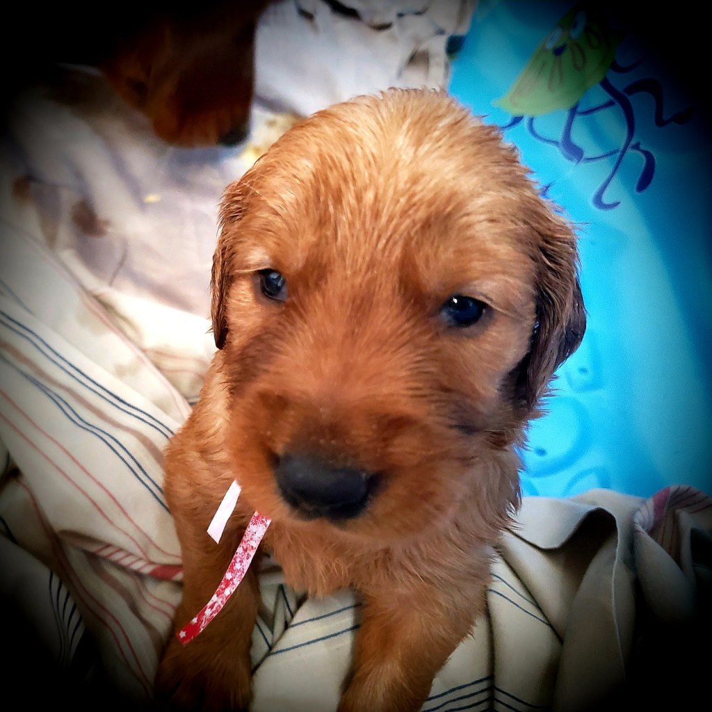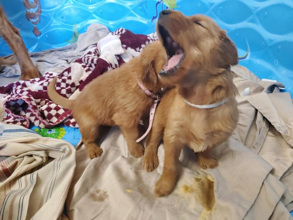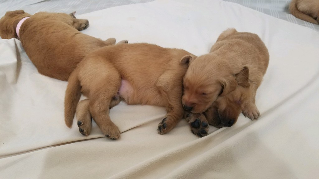 And then, of course, there’s the puppy thing. I would be remiss if I didn’t post a few pics of the litter we’ll be choosing from (most likely have chosen from). Mrs C has been spending an inordinate amount of time on the phone with the breeder, or over at the breeder’s house cuddling them and helping to feed them. The mama got sick just days after the pups were born so hand-feeding became a constant thing. Luckily, my wife loves the nurturing of puppies thing. She’s got a heart of gold(en).